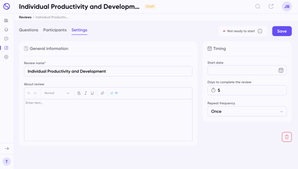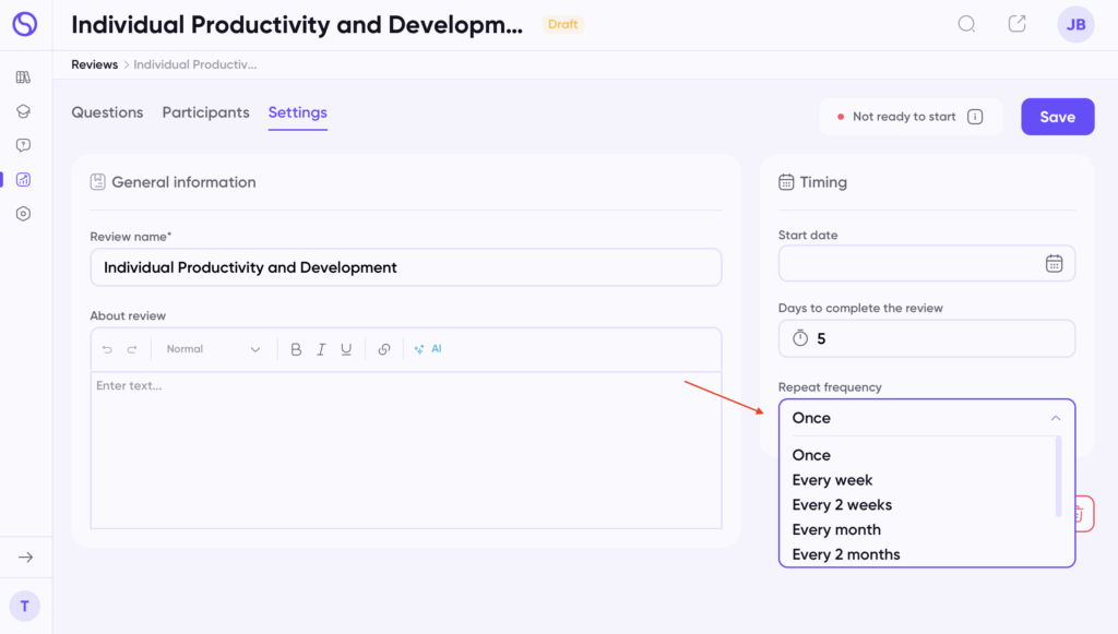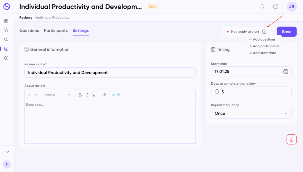 In this section, you can change the name of the review, add its description, and set the start date and duration of the review.