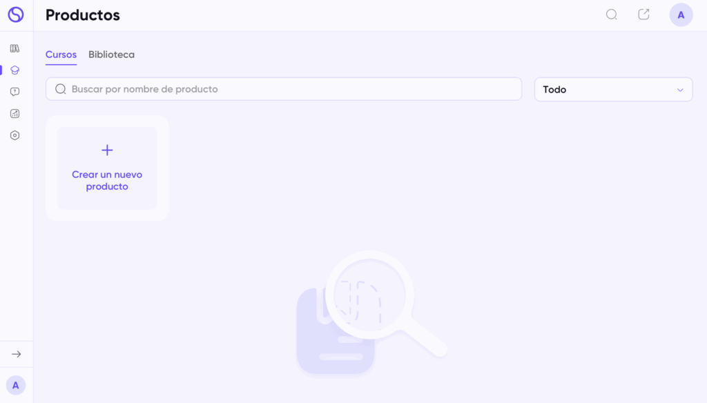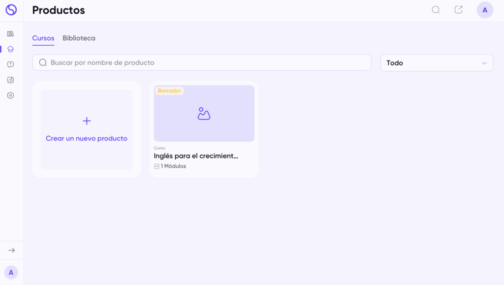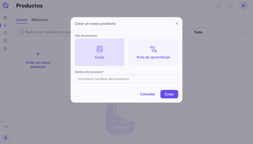 Para crear productos de formación, debe hacer clic en “Crear nuevo producto” en la página principal. A continuación, se abrirá una ventana donde podrá elegir entre la creación de un nuevo curso o una trayectoria de aprendizaje, así como asignarles un nombre.