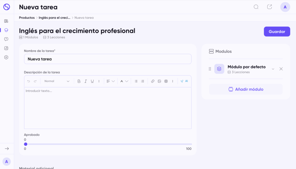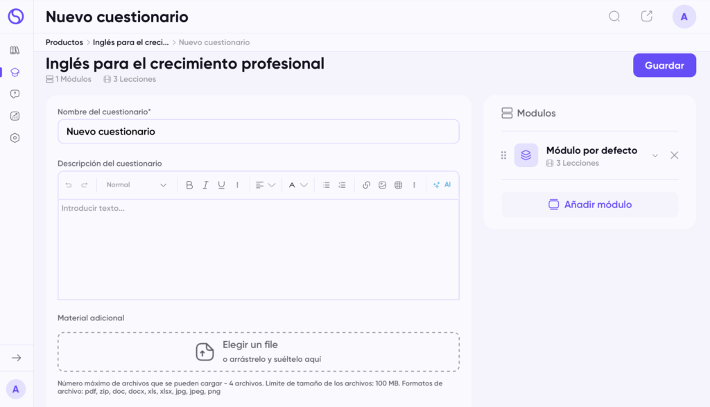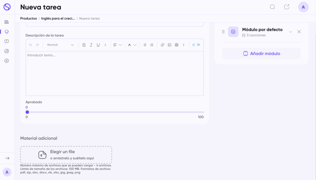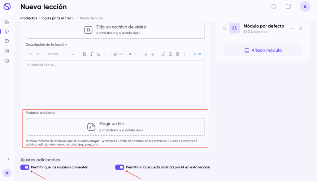También es posible incluir materiales adicionales en la lección en diferentes formatos (documentos, hojas de cálculo, presentaciones, etc.).
