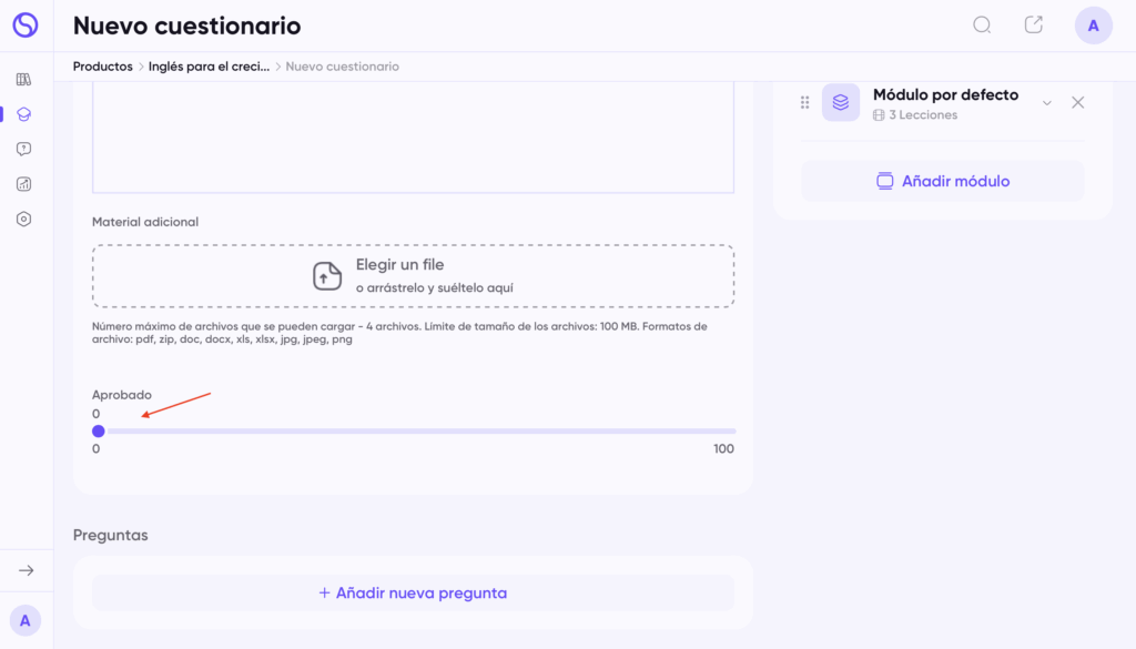 Además, está disponible la opción “Aprobado”, donde puede establecer la cantidad mínima de puntos necesarios para aprobar el test con éxito.