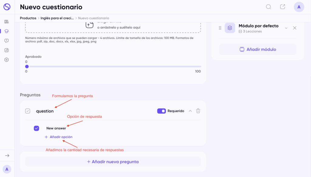 En la parte inferior de la página, encontrará la opción “Añadir nueva pregunta”, que le permitirá crear el test.