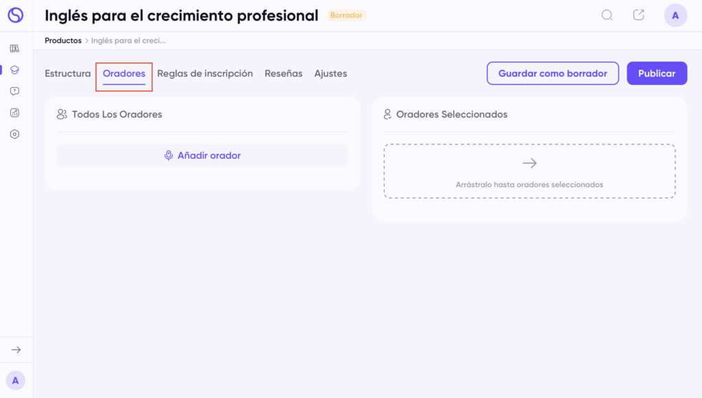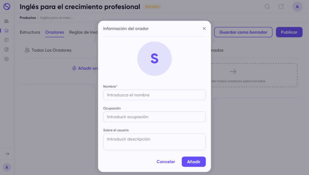 Al hacer clic en el botón “Añadir orador”, será redirigido a una página especial donde podrá indicar su nombre, especificar en qué área el ponente tiene especialización y escribir una descripción detallada sobre él.