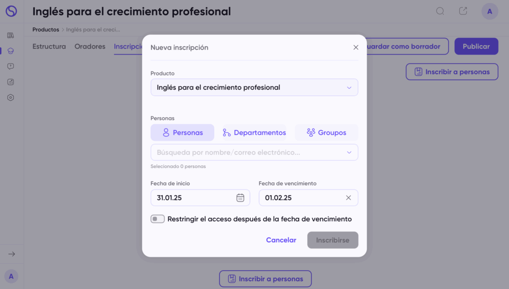 A continuación, se abrirá una ventana donde podrá asignar el acceso al curso a personas individuales, grupos o departamentos completos.