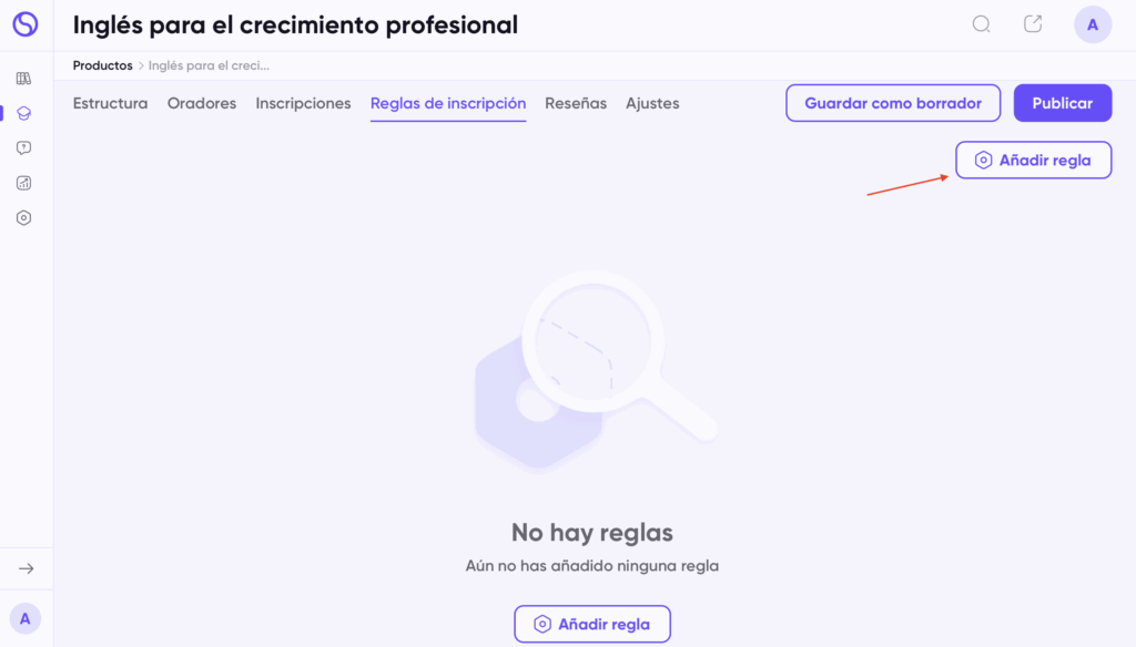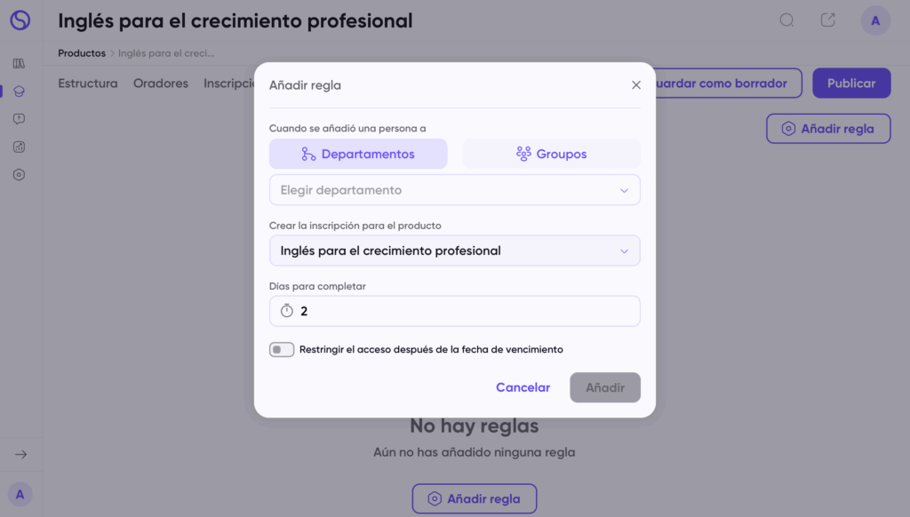Puede especificar los departamentos o grupos de personas para los cuales se establecerán las reglas, incluyendo el número de días para completar el curso. Para ello, debe hacer clic en el botón “Añadir regla”.