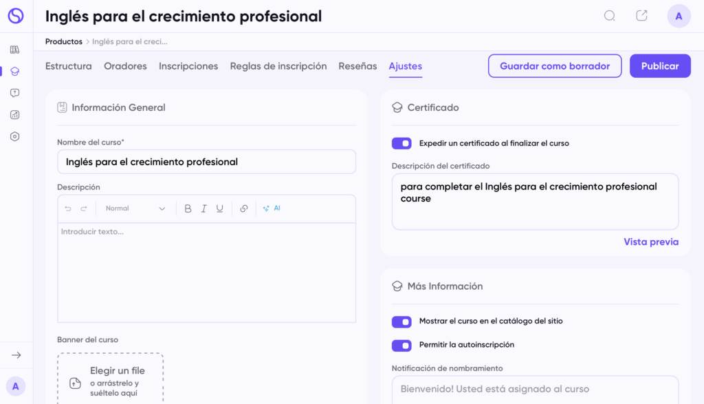 - La opción “Permitir la autoinscripción” permite que los usuarios se inscriban en el curso por sí mismos sin la intervención del administrador. Si esta función está activada, los usuarios pueden seleccionar y comenzar a realizar los cursos disponibles a su discreción.