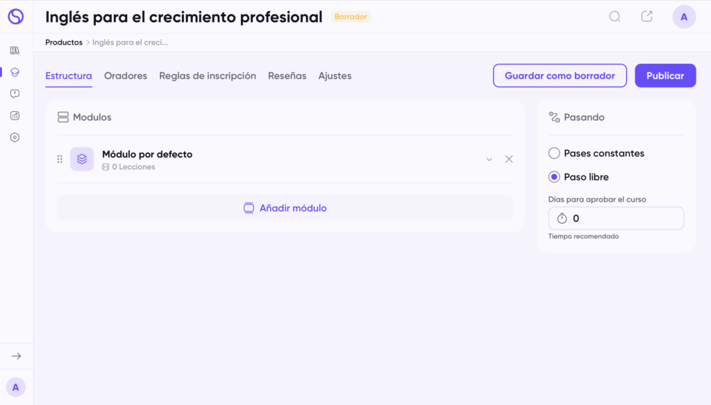 Una vez que haya creado un nuevo curso, este aparecerá en la página principal (por ejemplo, el curso “Inglés para el crecimiento profesional”).