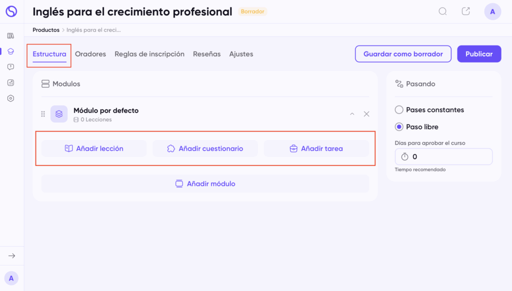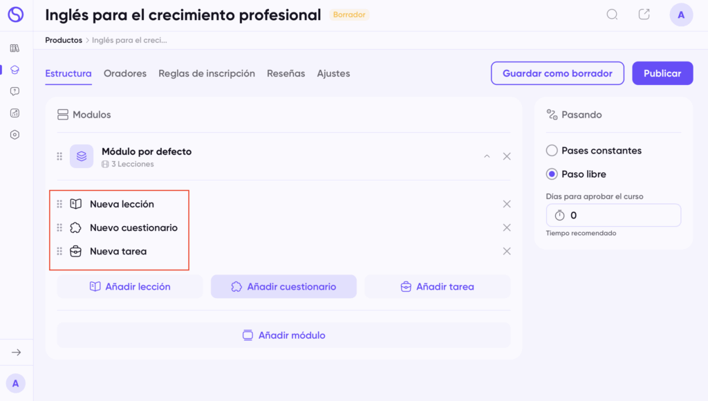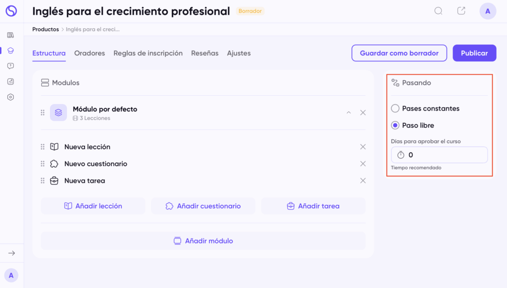 Durante la creación de la estructura del curso, es posible elegir entre dos tipos de progresión: constantes o libre.