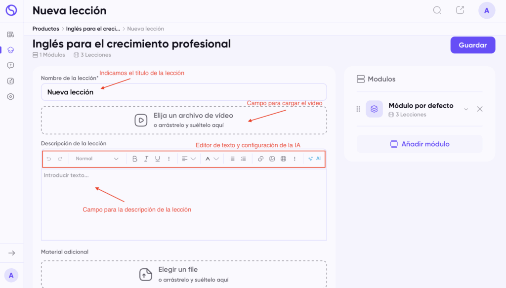 Comenzaremos con la configuración de la lección. En la página de la lección, se puede modificar su título, añadir videos educativos y una descripción.