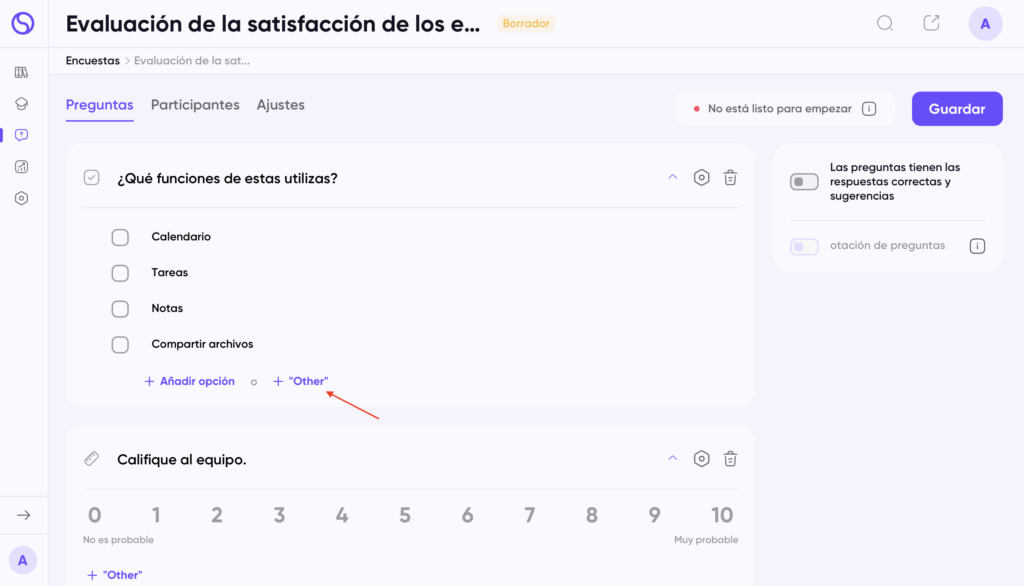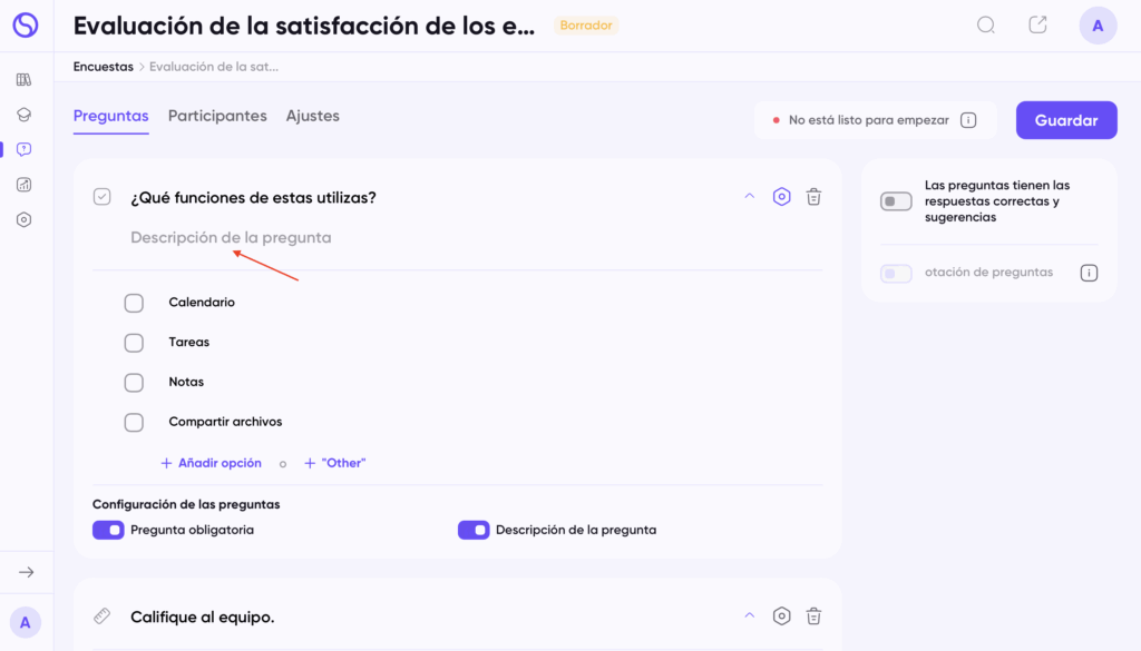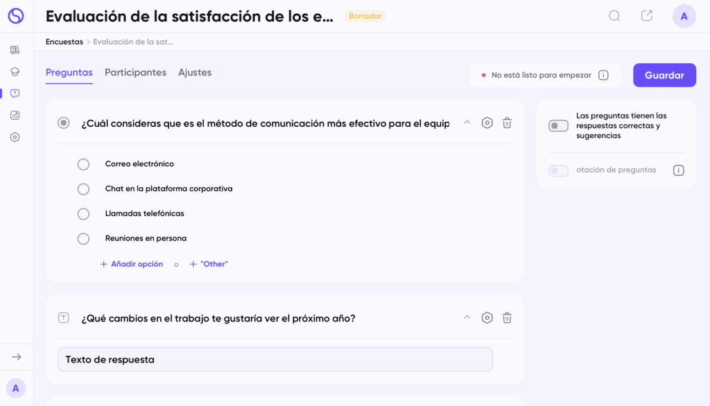Esta sección está destinada a la creación y edición de preguntas a las que los participantes deben responder. Aquí podrá agregar preguntas, definir los tipos de respuestas (valoración, respuesta de texto, elegir una, y elegir una o más respuestas), así como configurar el orden y la forma de las preguntas.