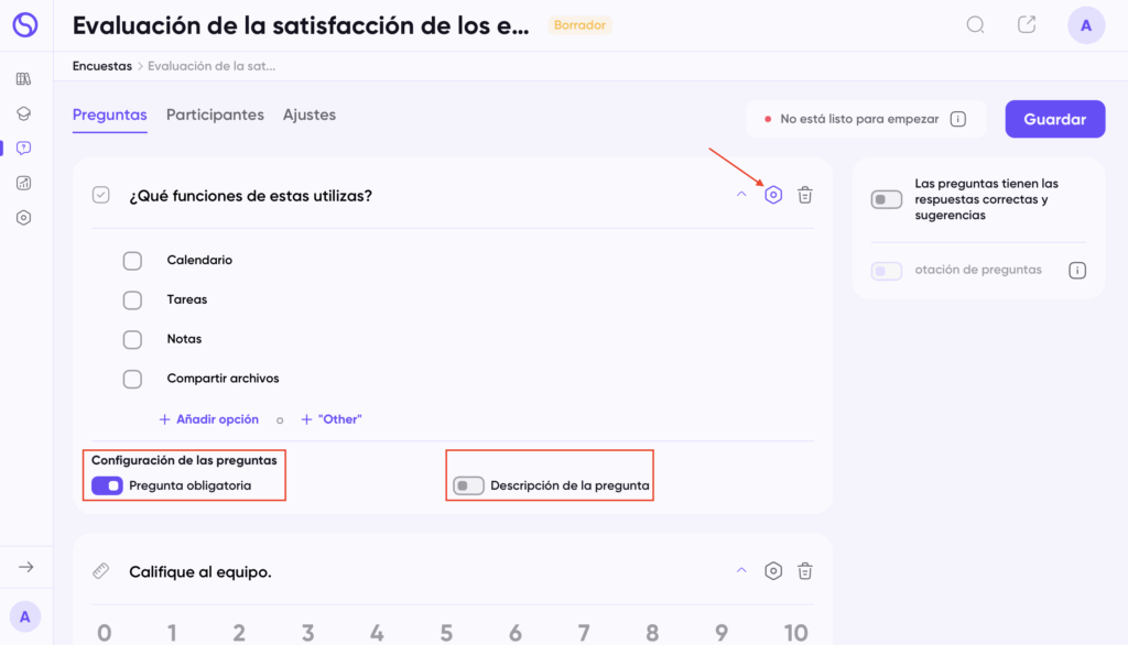 Pregunta obligatoria: con esta opción activada, la respuesta a esa pregunta es obligatoria. El empleado no podrá completar la encuesta hasta que responda a esa pregunta.