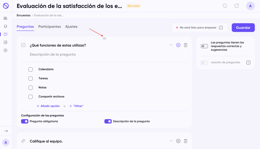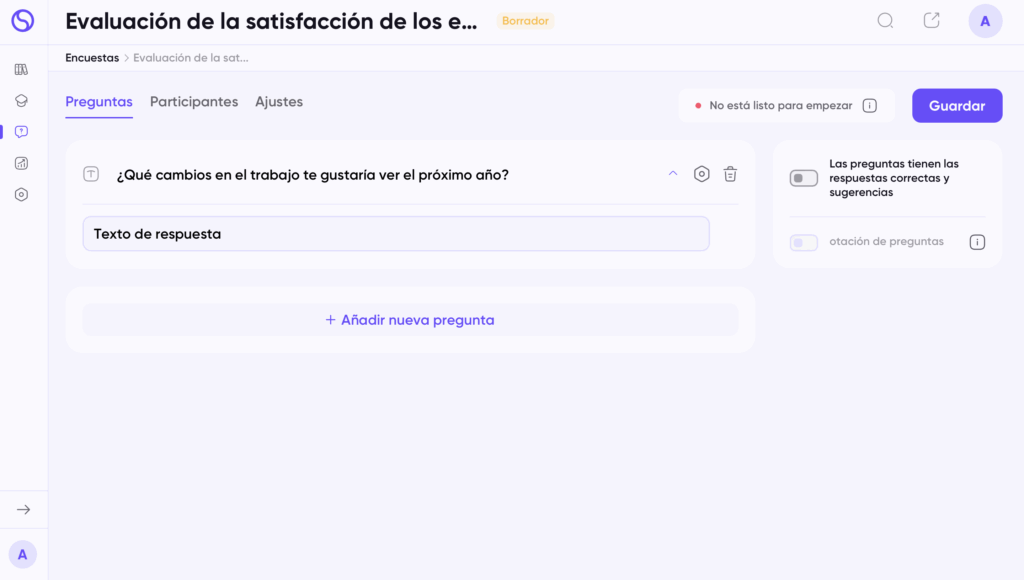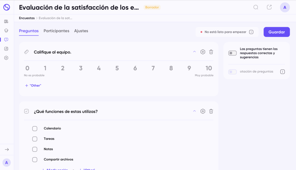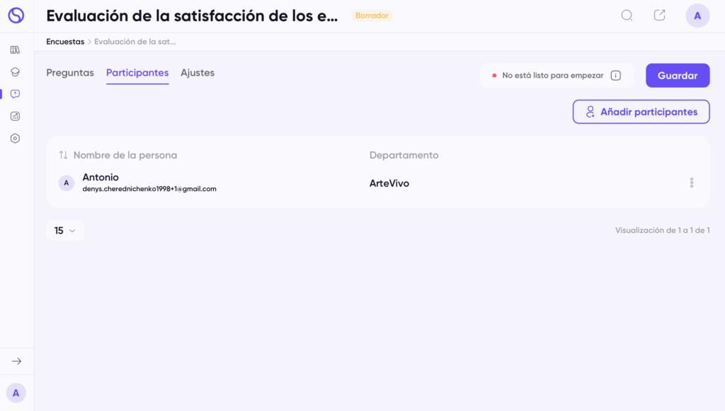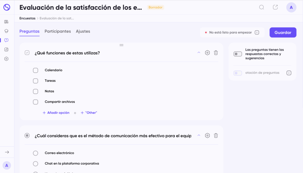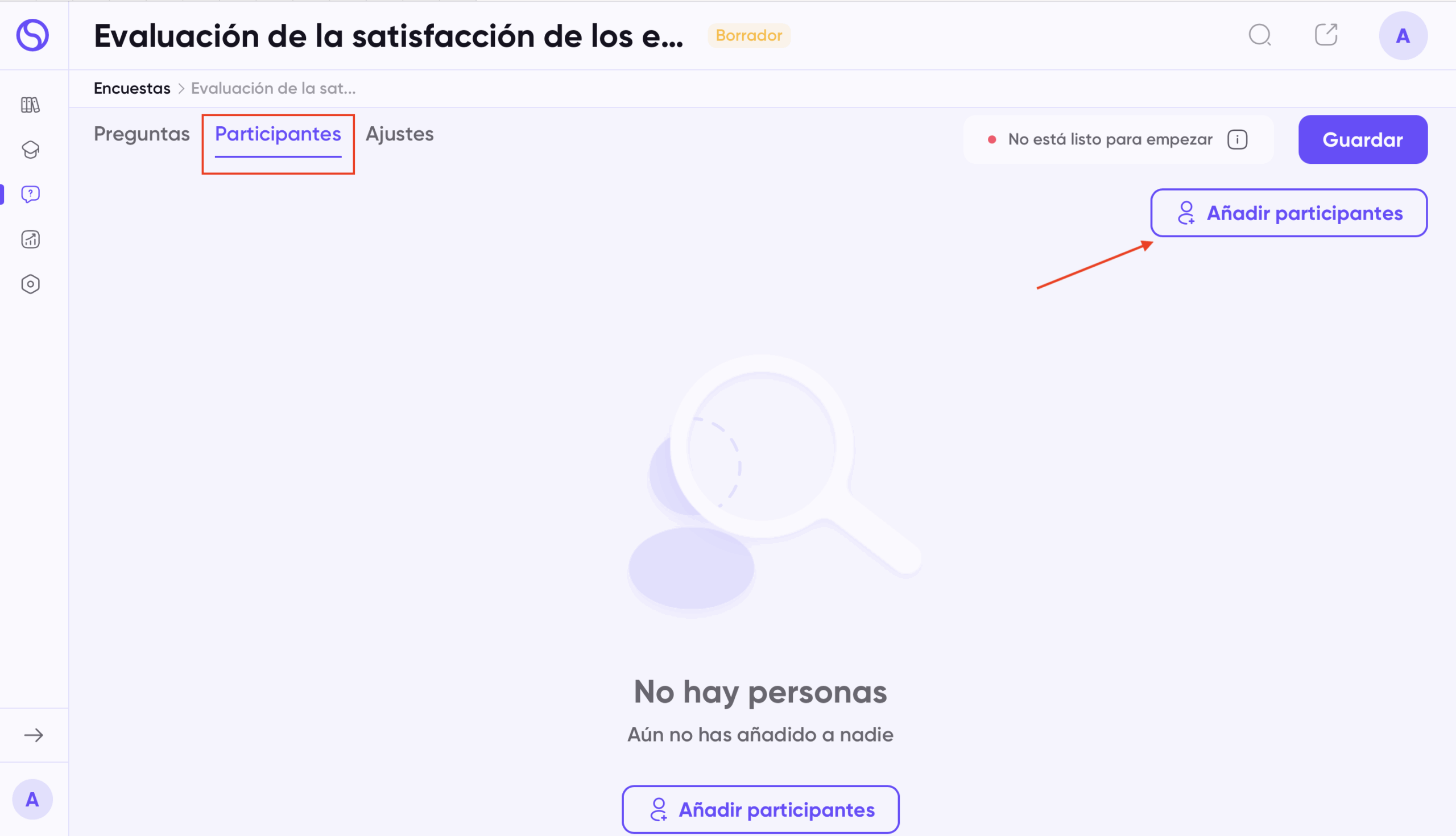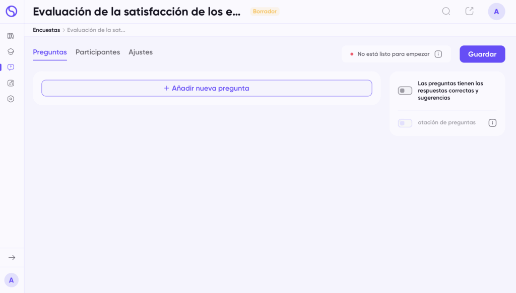 La encuesta consta de tres secciones: preguntas, participantes y ajustes.
