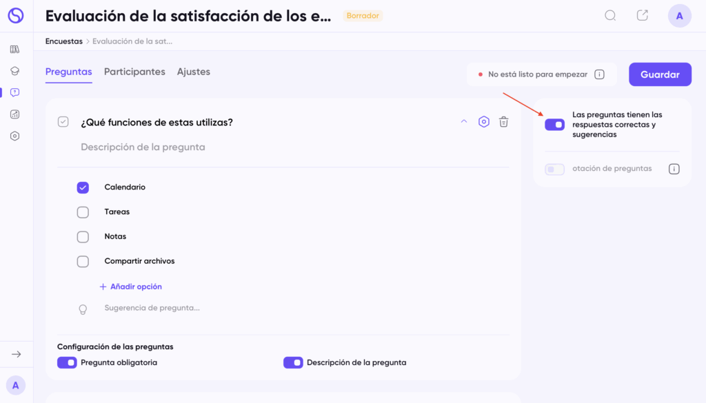 En la encuesta existe la función “Las preguntas tienen las respuestas correctas y sugerencias”. Al activar esta función, la encuesta se convierte en un test donde se deben seleccionar las respuestas correctas y, si es necesario, agregar pistas a cada pregunta.