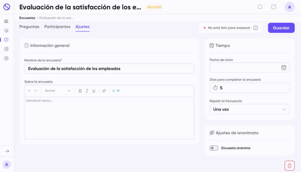 En esta sección, puede cambiar el nombre de la encuesta, agregar una descripción y establecer la fecha de inicio y la duración de la encuesta.