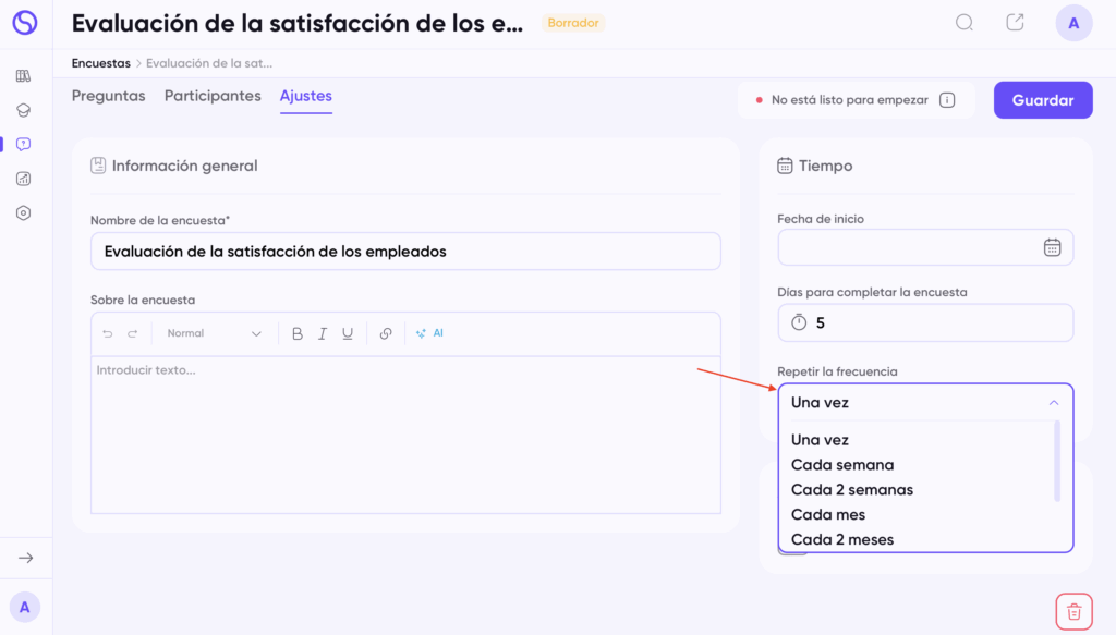 Además, hay la opción de establecer la frecuencia de repetición de la encuesta. Esto permite que la encuesta se repita automáticamente después de un cierto período de tiempo.