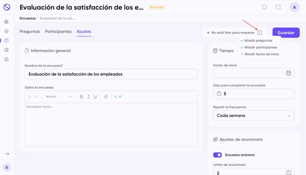 En el sistema hay sugerencias que ayudan a comprender qué debe añadirse para que la encuesta pueda ser lanzada con éxito.