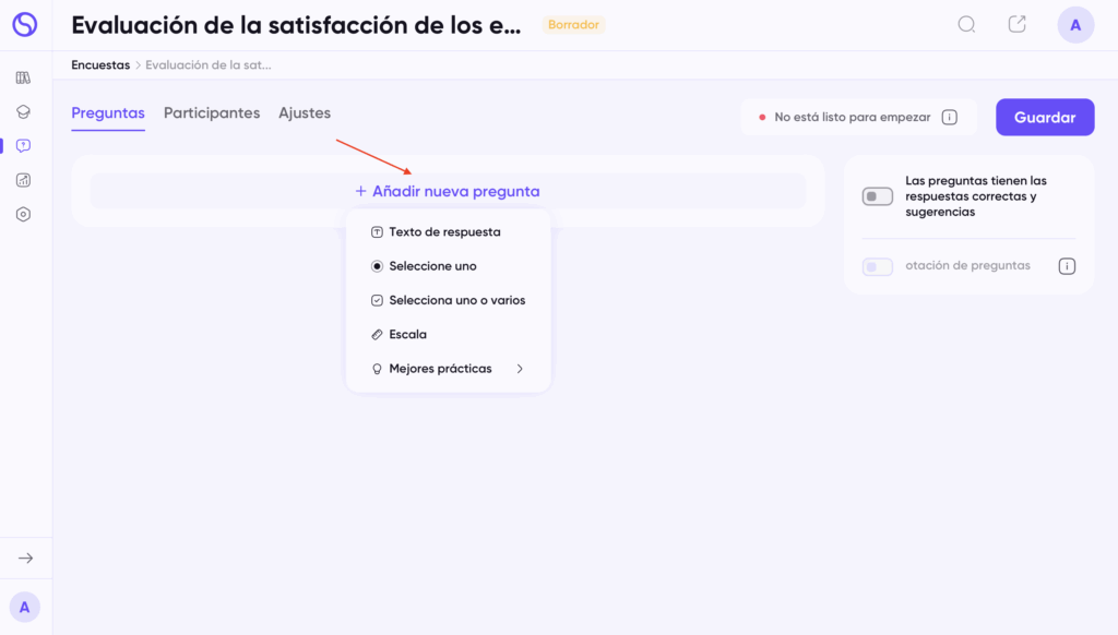 Para comenzar a crear la encuesta, haga clic en “Añadir nueva pregunta” y seleccione el tipo de pregunta.