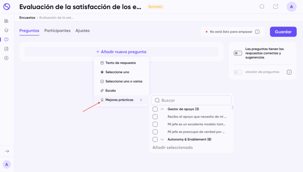 Mejores prácticas – le permite seleccionar preguntas ya preparadas por nuestros especialistas.