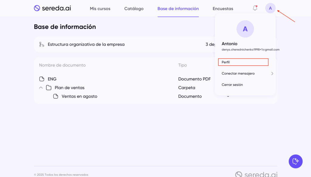 Para acceder a la configuración de su perfil, haga clic en su avatar y seleccione la sección “Perfil”.