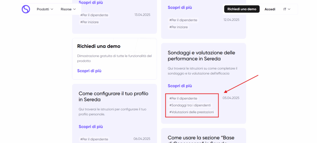 Il Centro Assistenza è uno spazio self-service dove puoi imparare come funziona Sereda.ai. Include una raccolta di articoli che spiegano ogni funzionalità essenziale: dalla configurazione della knowledge base al lancio di sondaggi e valutazioni delle performance. E la buona notizia è che è disponibile in più lingue, così tutto il tuo team può seguirlo senza difficoltà.