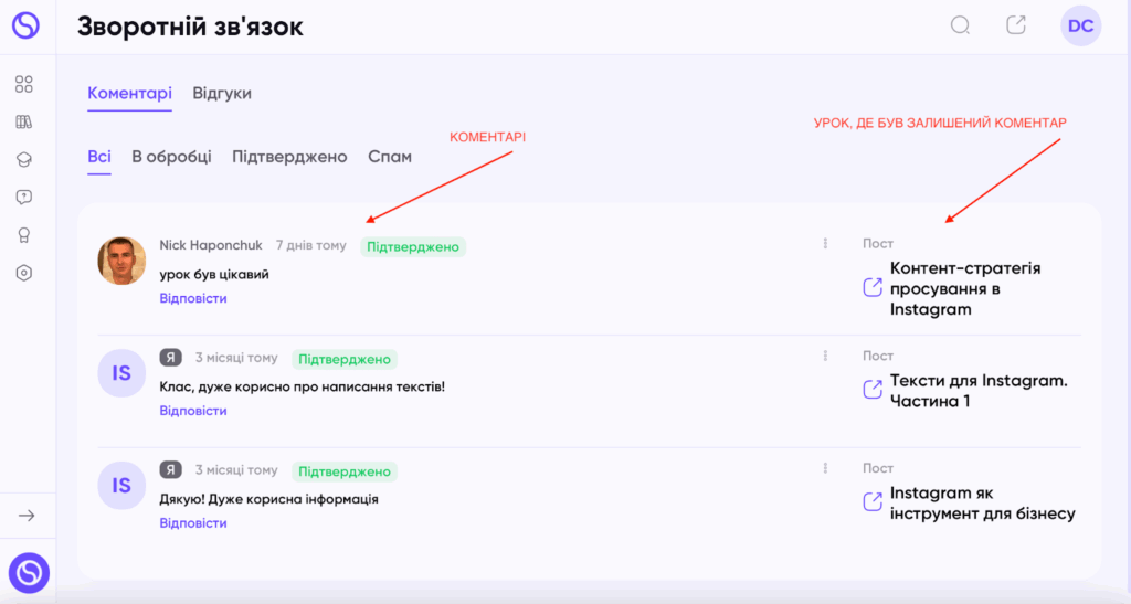 Тут зберігаються всі коментарі співробітників з усіх уроків від різних курсів.