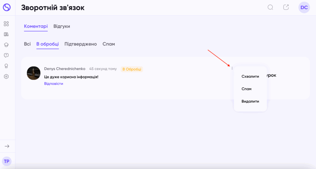 Відгуки спочатку потрапляють до вкладки “В обробці”, а після цього Ви можете їх підтвердити або видалити з системи.