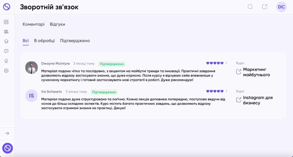Тут відображаються відгуки співробітників стосовно курсів.