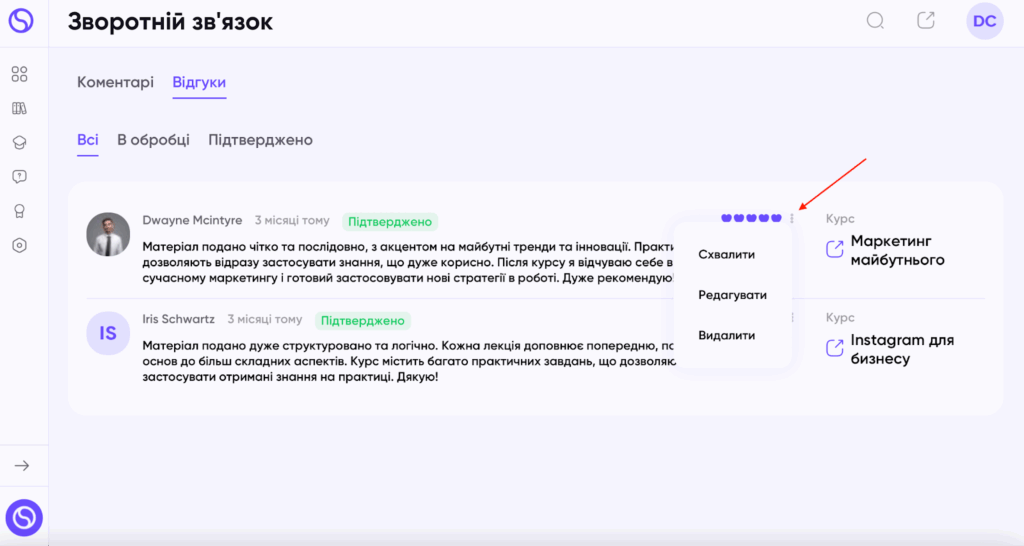 Окрім того, відгуки підлягають редагуванню. Для цього потрібно натиснути на три крапки біля тексту відгука та вибрати опцію “Редагувати”.