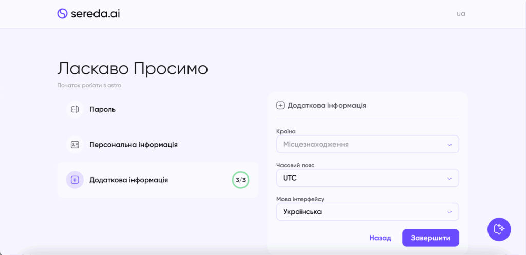 Виберіть місцезнаходження, часовий пояс і налаштуйте мову інтерфейсу.