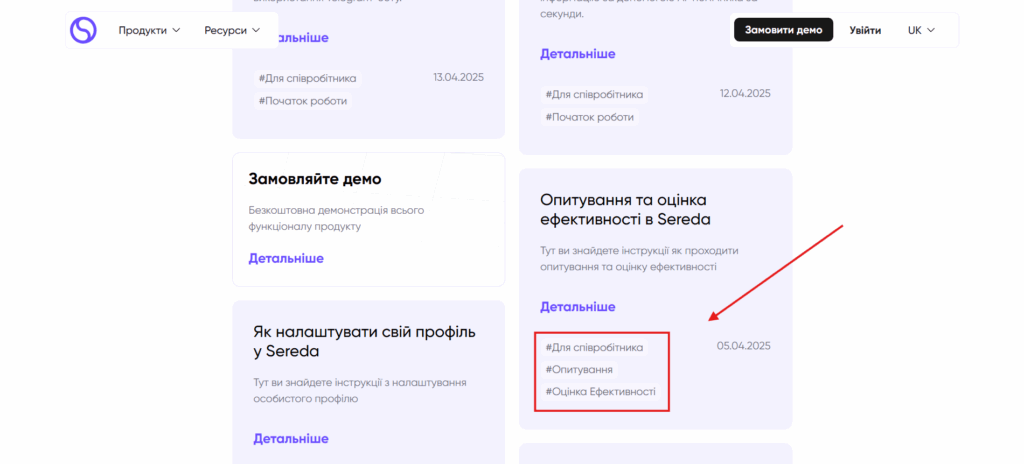Це ваша простір самообслуговування, де можна крок за кроком вивчити, як працює Sereda.ai. У ньому зібрані докладні статті про всі ключові можливості платформи: від налаштування бази знань до запуску опитувань, навчання та оцінювання ефективності.